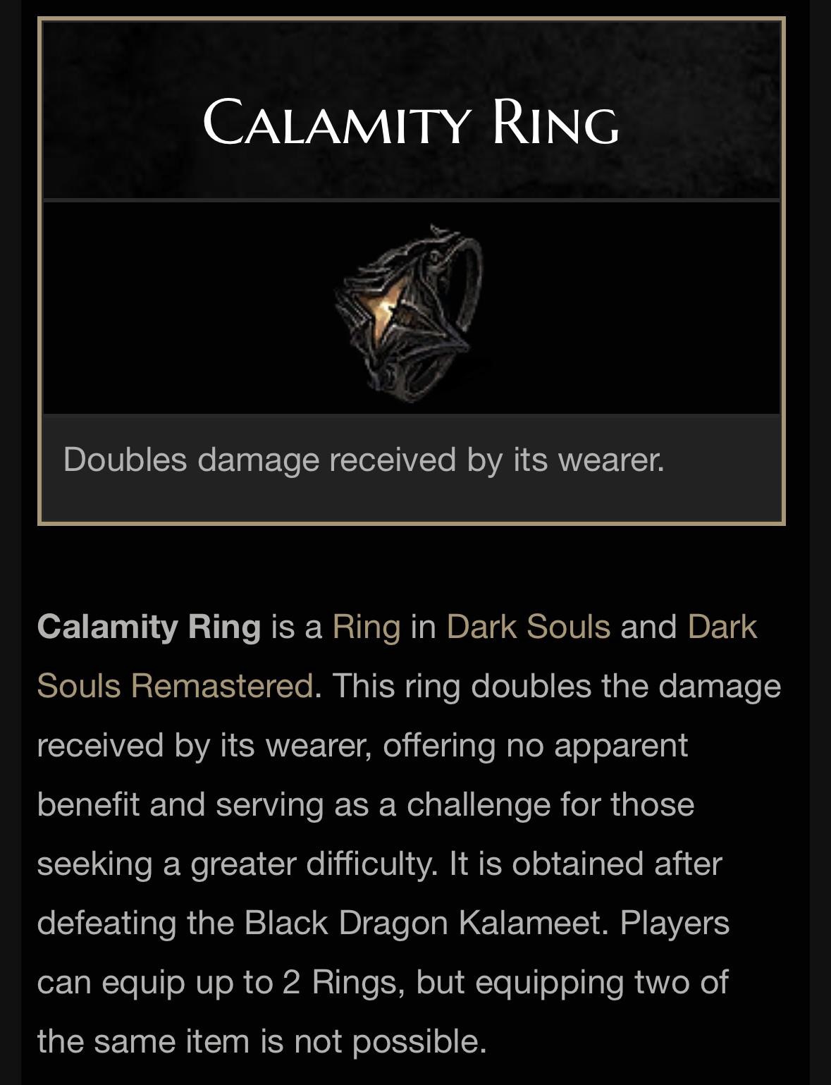 黑龙应该算是魂一Boss难度的顶峰了吧,再看看战胜后给的东西,灾难戒指——「装备者所受的伤害会加倍,无有利效果,一般来说是用不着装备的」,各位大概能体会到黑魂的恶趣味了吧,概括来说,这就好比登山,并不是因为山上有什么才去攀登,而是因为山就在那里。