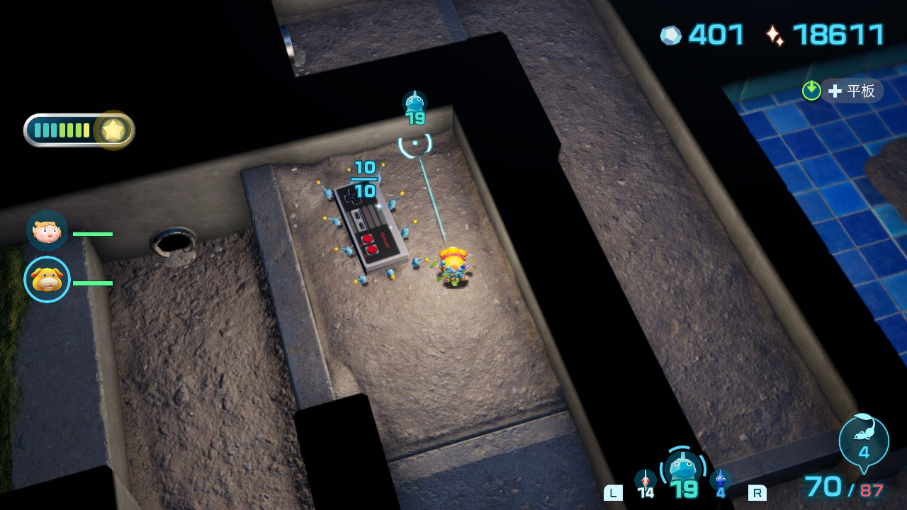 地下还有一类是当多虑对战,即在同一张地图上与AI控制的对手进行竞赛,在规定时间结束后以获得总分较多的那一方为胜者,这个模式的策略性就更强了,不仅要考虑如何高效地组织皮克敏运输资源,也得考虑防御对手的骚扰,甚至主动掠夺对方资源。玩法上来说这里是最像传统RTS的,不同颜色的皮克敏相当于不同的兵种,能够带「兵」拥有独立战力且带有技能(跳跃、冲刺)的欧庆算是英雄单位。而且这个模式下不光需要开采矿产、猎取中立生物,还需要防御及进攻,根据对手的策略来及时调整应对方案。