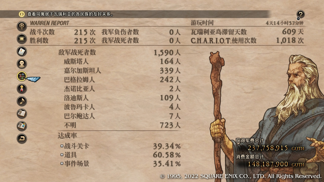 高强度打了一个月,系统显示游玩120小时以上。丰富的系统,精彩的故事,生动的人物塑造,凭借着种种优点,在1995年问世的初版就已经在SRPG历史上留下了浓墨重彩的一笔。从如今的重制版(“重生”)中依然能领略这款游戏极高的素质,新加入的随机卡牌以及Boss固有四卡常被人诟病,但都不算是明显的缺陷,对我个人而言,更难以接受的是后期流程过于冗长带来的疲劳感。
