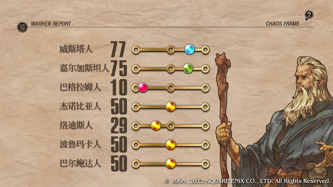 针对老游戏重制,大部分人可能还是希望尽量能做到原汁原味,这方面皇骑重生也确实做到了,而对于一周目的内容量来说,大量的战斗包括深层的宫殿在当初游戏匮乏的年代绝对是一个不可多得的优点,甚至是厂商良心的体现,更何况战斗奖励还有不少稀有材料和装备。但在如今这个游戏选择更加多样,玩家从来不缺游戏玩的年代,在游戏后期堆大量支线很难不被怀疑是一个撑时长的设计,要不就把这些支线分散在全流程各个章节(当然这样的话剧情就很难跟原版保持完全一致了);要不就是把最终战提前,强度拉低,把针对收集/强化要素的支线放到通关后内容,相信这是一种比较合适的做法。说起通关内容,本作通关后仍然有非常多可“肝”的东西,还有时空之轮系统可以回到过去的锚点,去调整当初的选择,来游玩另一种可能下的时间线,足以可见本作的“量大管饱”,但我是有点疲了,先一周目吧。